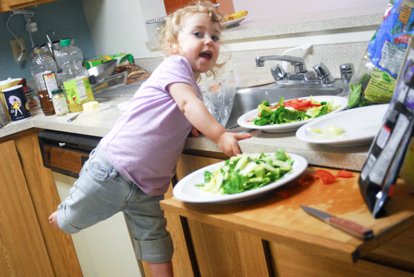 While our dinner was cooking, I decided to make the salads. So out came our three plates, as well as all of the salad stuff - lettuce, tomatoes, carrots, cucumber, etc...